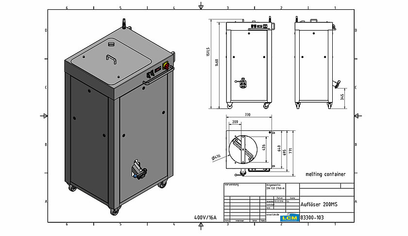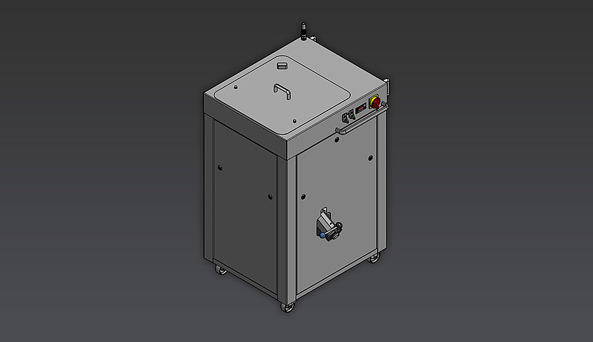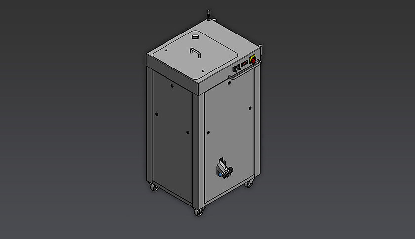 - Machine housing made of stainless steel, mobile on stable swivel castor